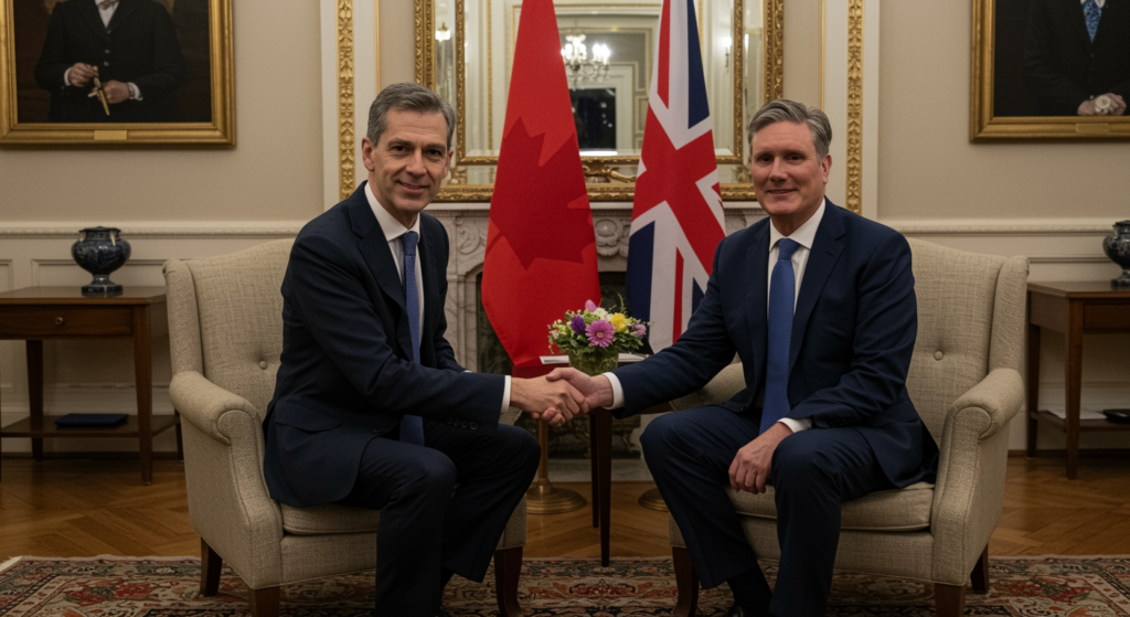 On March 16, 2026, Canadian Prime Minister Mark Carney met with United Kingdom Prime Minister Sir Keir Starmer at 10 Downing Street in London for bilateral talks. This meeting occurred during Prime Minister Carney’s visit to the United Kingdom, following his recent engagements at the Canada-Nordic Summit in Oslo and prior diplomatic activities.