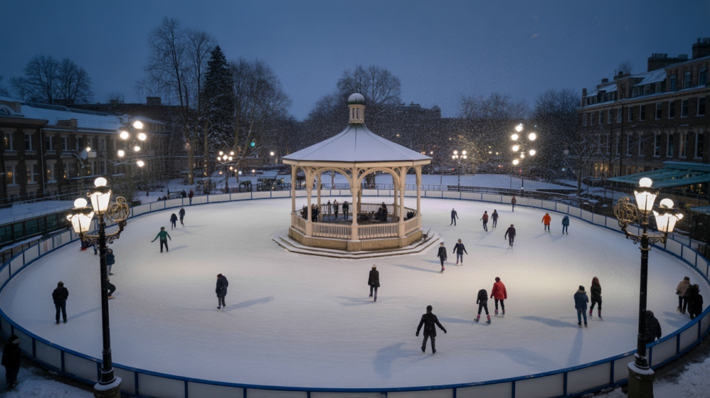 We observed that the Victorian bandstand centrepiece hosts live performances every evening from 6pm, creating an atmospheric backdrop rarely found in traditional rinks. The surrounding fairy-lit trees and period lampposts enhance the nostalgic ambience without feeling contrived.